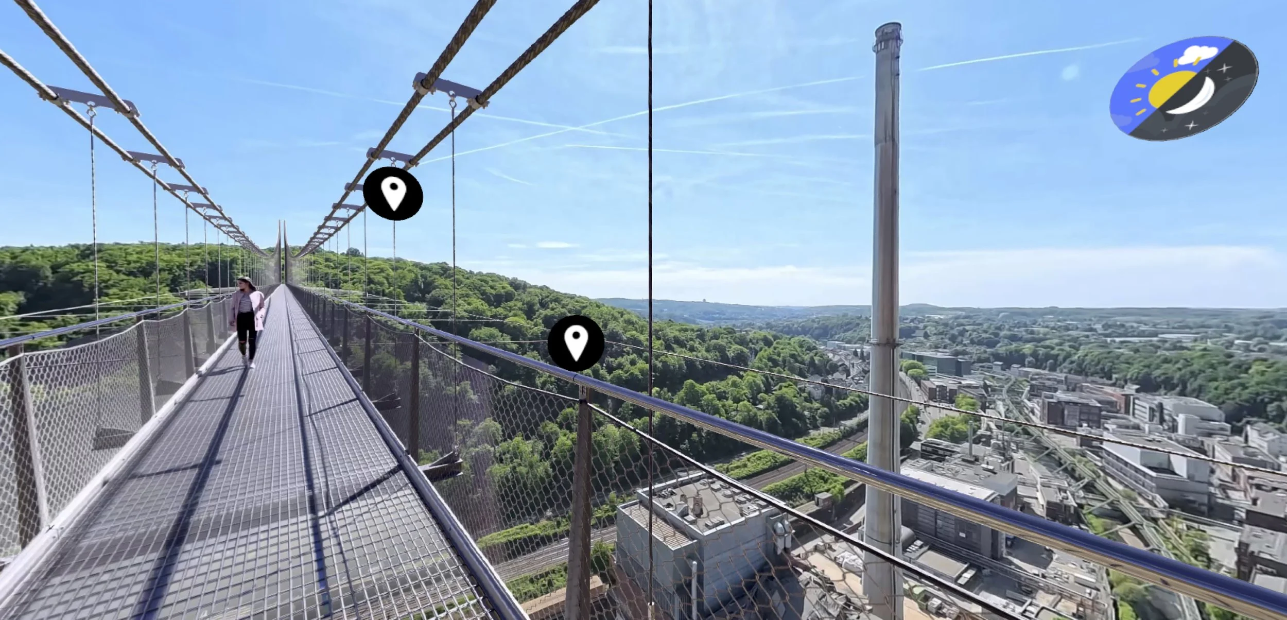 In dieser Web-VR-Anwendung können Sie die geplante Hängeseilbrücke zwischen Königs- und Kaiserhöhe virtuell erkunden und die Dimensionen des Bauwerks aus nächster Nähe erleben. Die interaktive 3D-Darstellung ermöglicht es, die Brücke aus verschiedenen Blickwinkeln zu betrachten und ein realistisches räumliches Gefühl für Konstruktion, Länge und Höhe zu gewinnen.